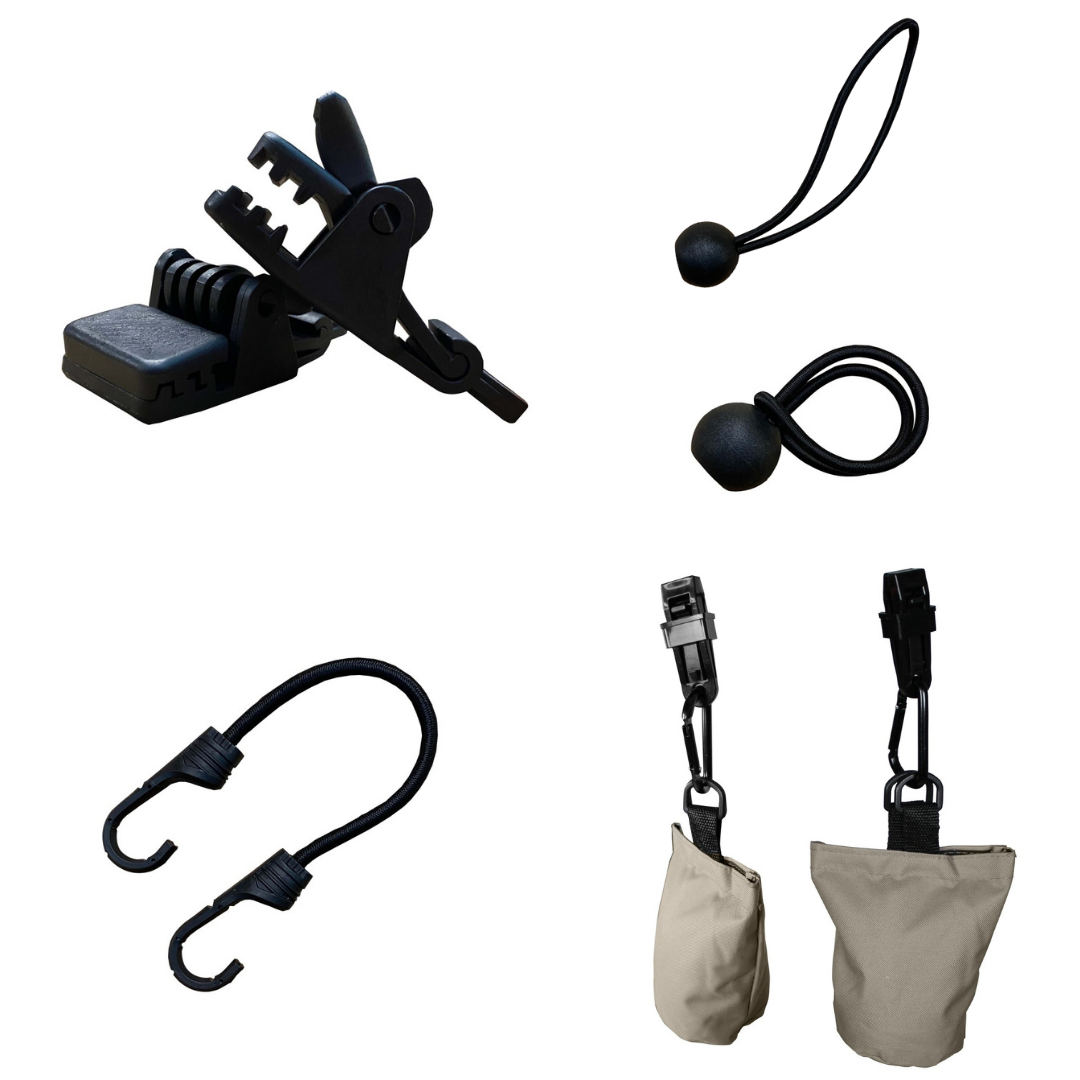 View our accessories category and choose clamps, hooks, bungee straps, bungee balls and sandbags.