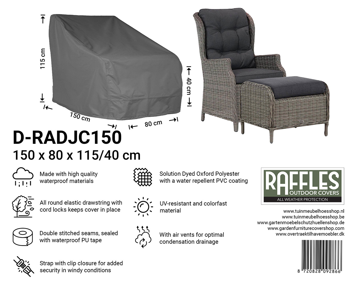 The fit of the RADJC series is tailored to adjustable lounge chairs with a high back and, if applicable, a separate footrest. The cover falls generously over back- and armrests and covers the chair down to close to the ground. The lower edge fits closely all round, so the wind has less grip and the cover stays neatly in place, while still being quick to put on and take off.