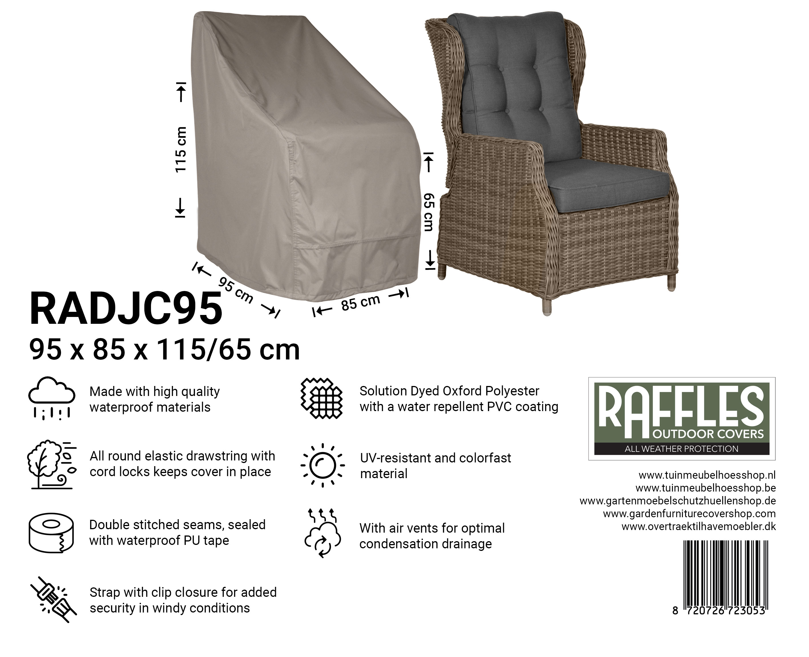The fit of the RADJC series is tailored to adjustable lounge chairs with a high back and, if applicable, a separate footrest. The cover falls generously over back- and armrests and covers the chair down to close to the ground. The lower edge fits closely all round, so the wind has less grip and the cover stays neatly in place, while still being quick to put on and take off.