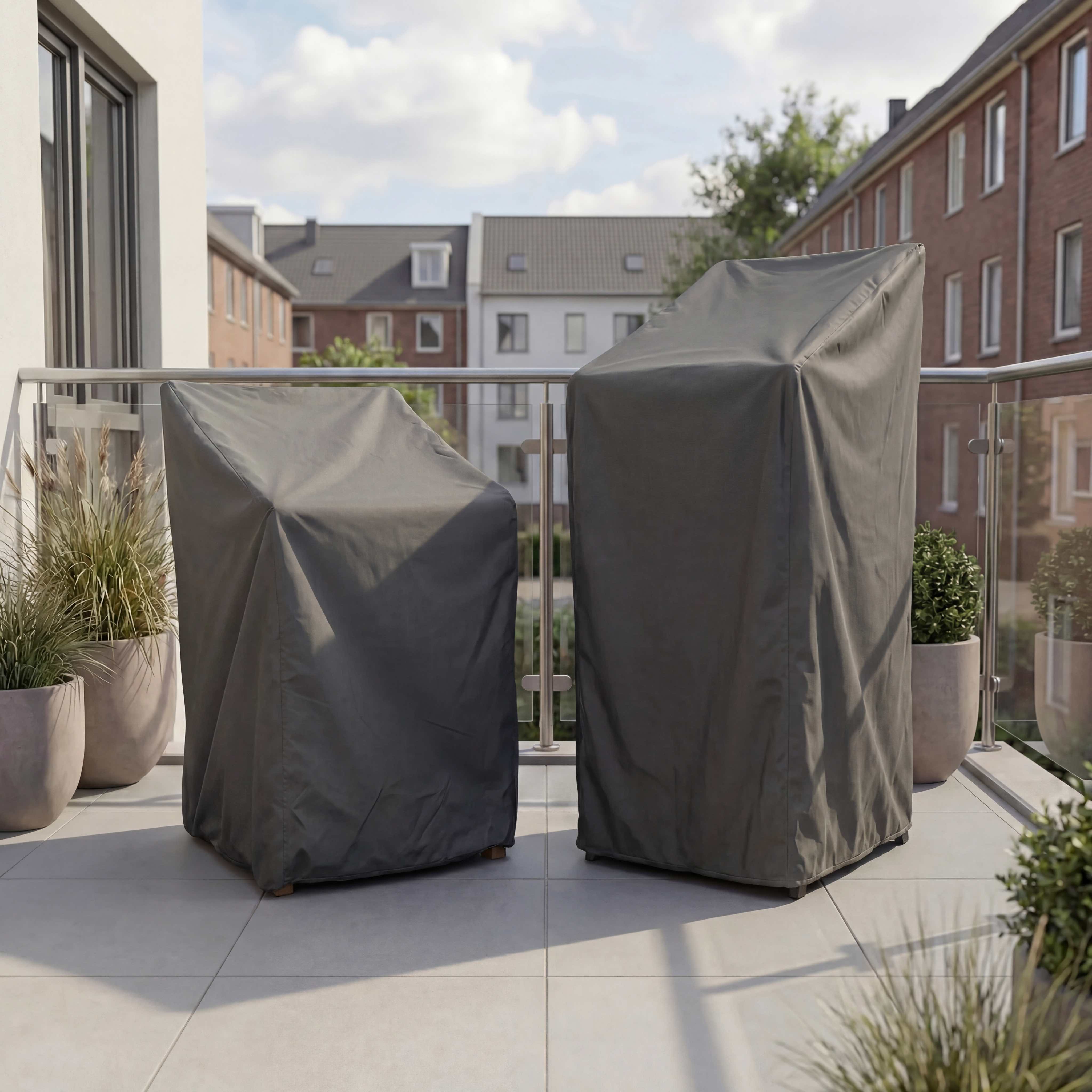 With the RSTACK series stacking chair covers from Raffles Covers you can protect several stacking chairs at once against the weather and dirt. Whether you have a compact stack of 4 chairs or a higher stack of up to approx. 8 chairs, there is always a suitable cover that protects your chairs against rain, sun, snow, dirt, green deposits and bird droppings.