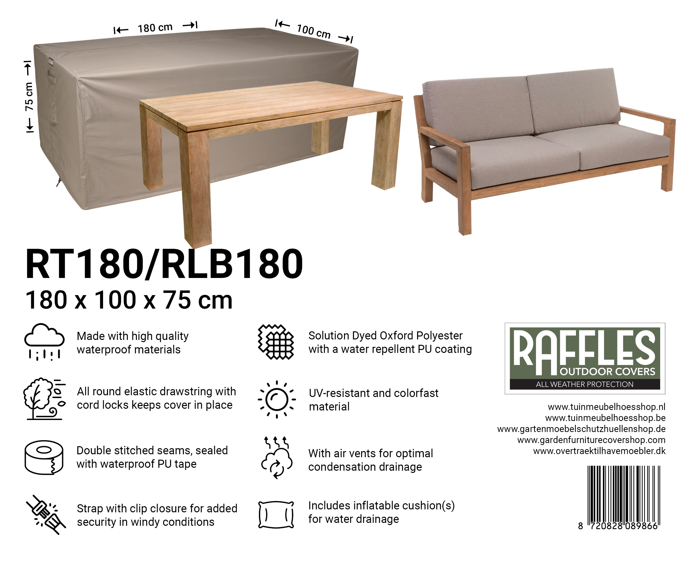 With the RT series garden table covers from Raffles Covers you can protect your garden table(s) all year round against rain, sun, dirt, green deposits, bird droppings and UV radiation. Whether you have a compact bistro table, a standard rectangular garden table or an extra-long XXL table, there is always a suitable cover so your table stays clean and is immediately ready for use.