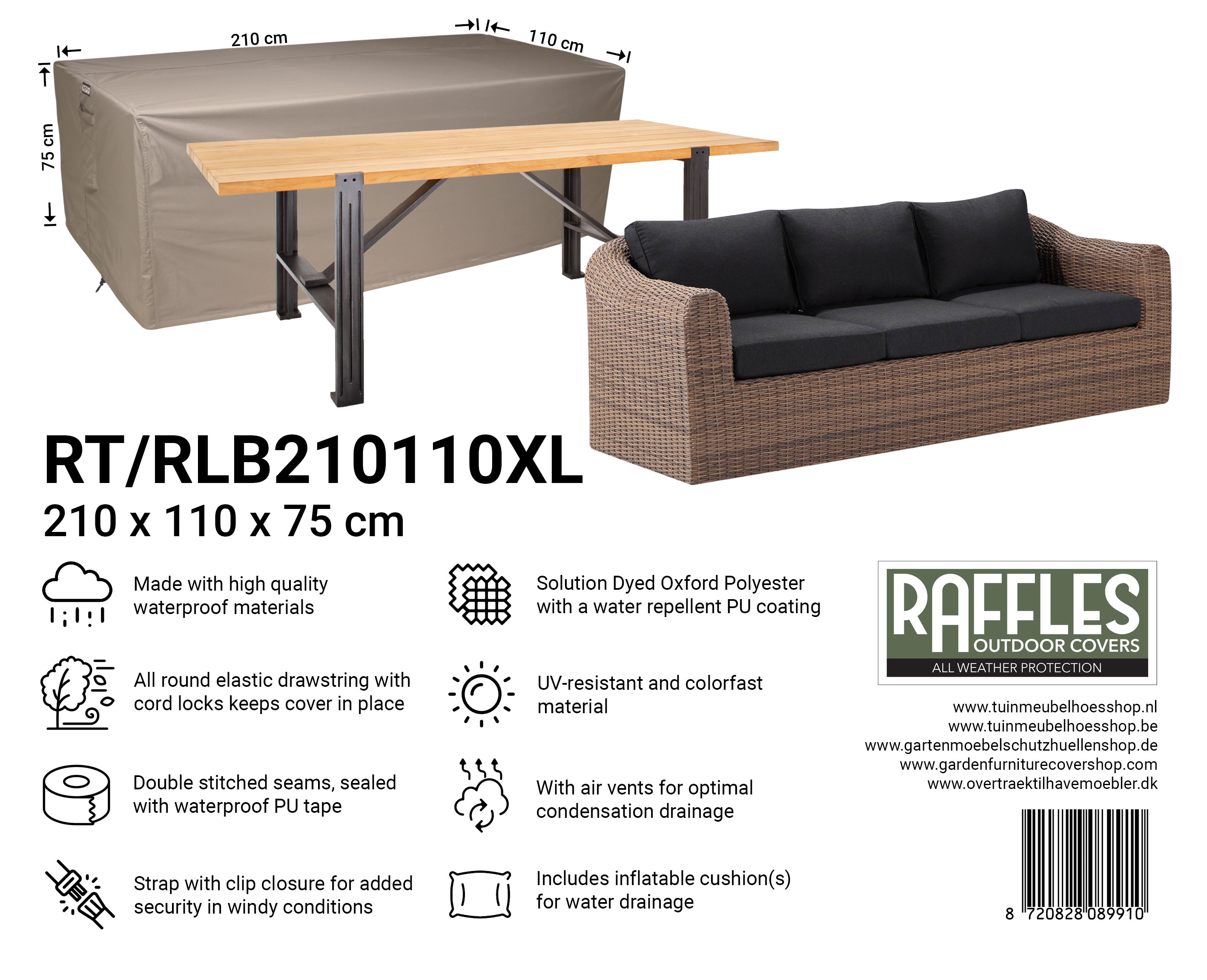 With the RT series garden table covers from Raffles Covers you can protect your garden table(s) all year round against rain, sun, dirt, green deposits, bird droppings and UV radiation. Whether you have a compact bistro table, a standard rectangular garden table or an extra-long XXL table, there is always a suitable cover so your table stays clean and is immediately ready for use.