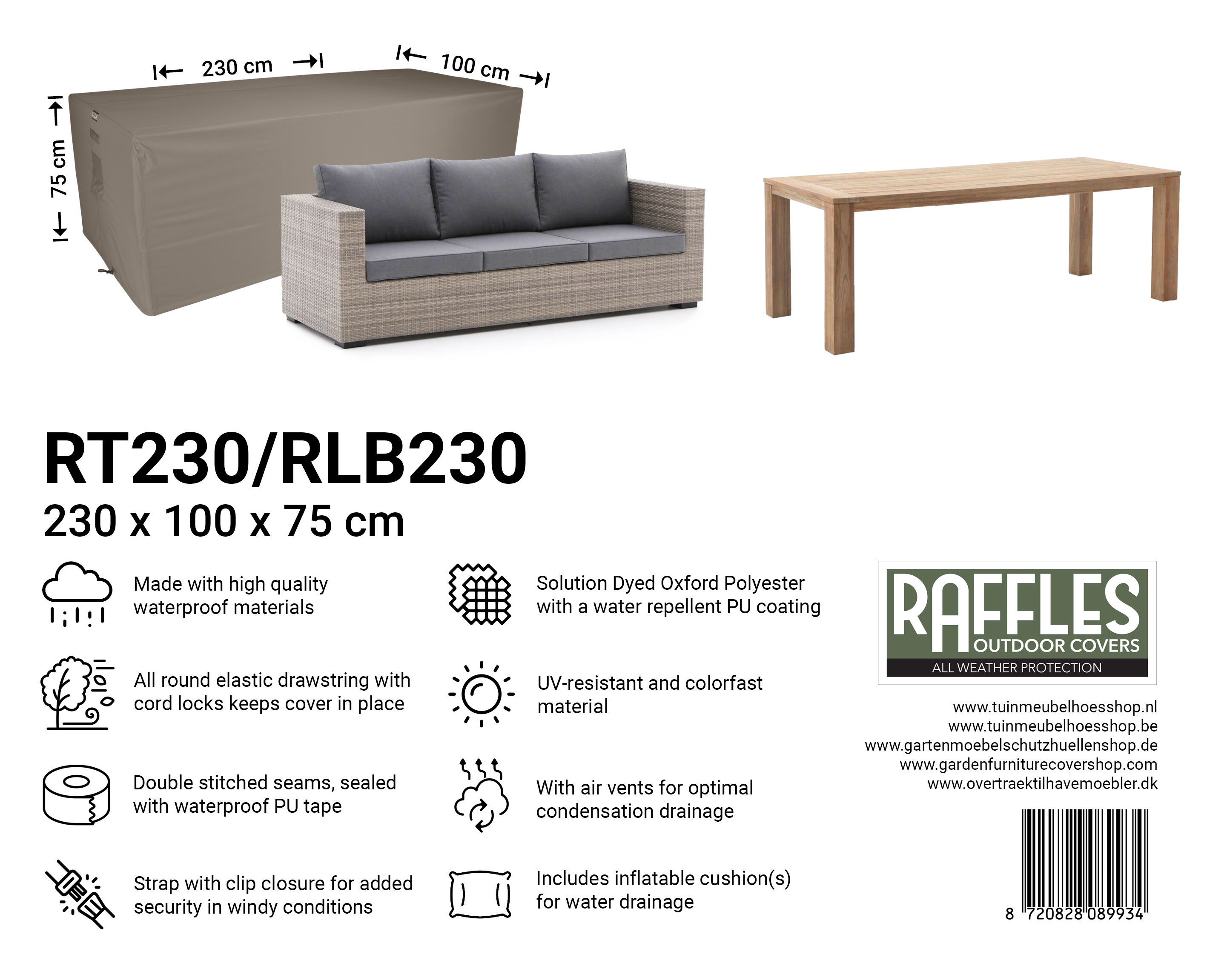 With the RT series garden table covers from Raffles Covers you can protect your garden table(s) all year round against rain, sun, dirt, green deposits, bird droppings and UV radiation. Whether you have a compact bistro table, a standard rectangular garden table or an extra-long XXL table, there is always a suitable cover so your table stays clean and is immediately ready for use.