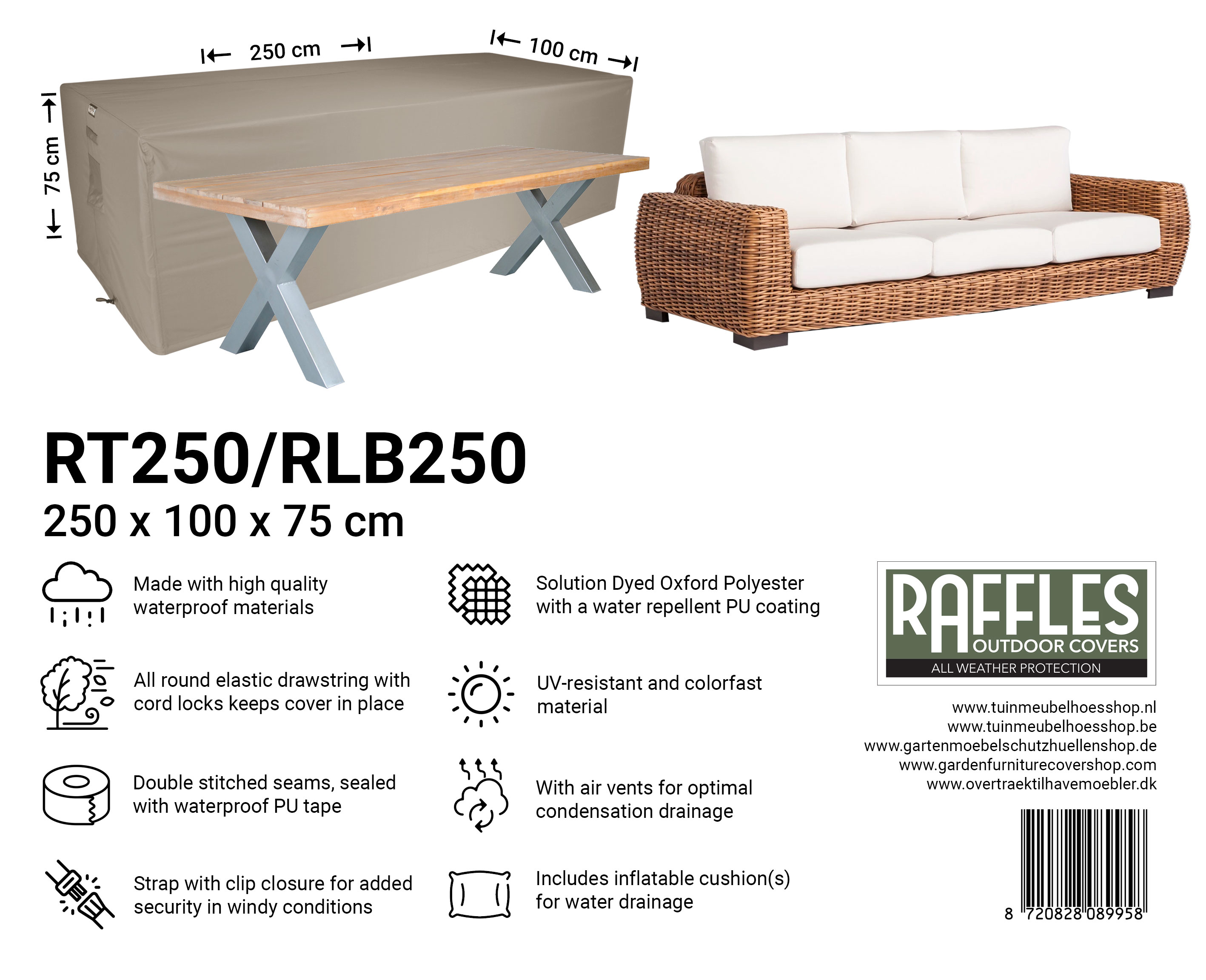 With the RT series garden table covers from Raffles Covers you can protect your garden table(s) all year round against rain, sun, dirt, green deposits, bird droppings and UV radiation. Whether you have a compact bistro table, a standard rectangular garden table or an extra-long XXL table, there is always a suitable cover so your table stays clean and is immediately ready for use.