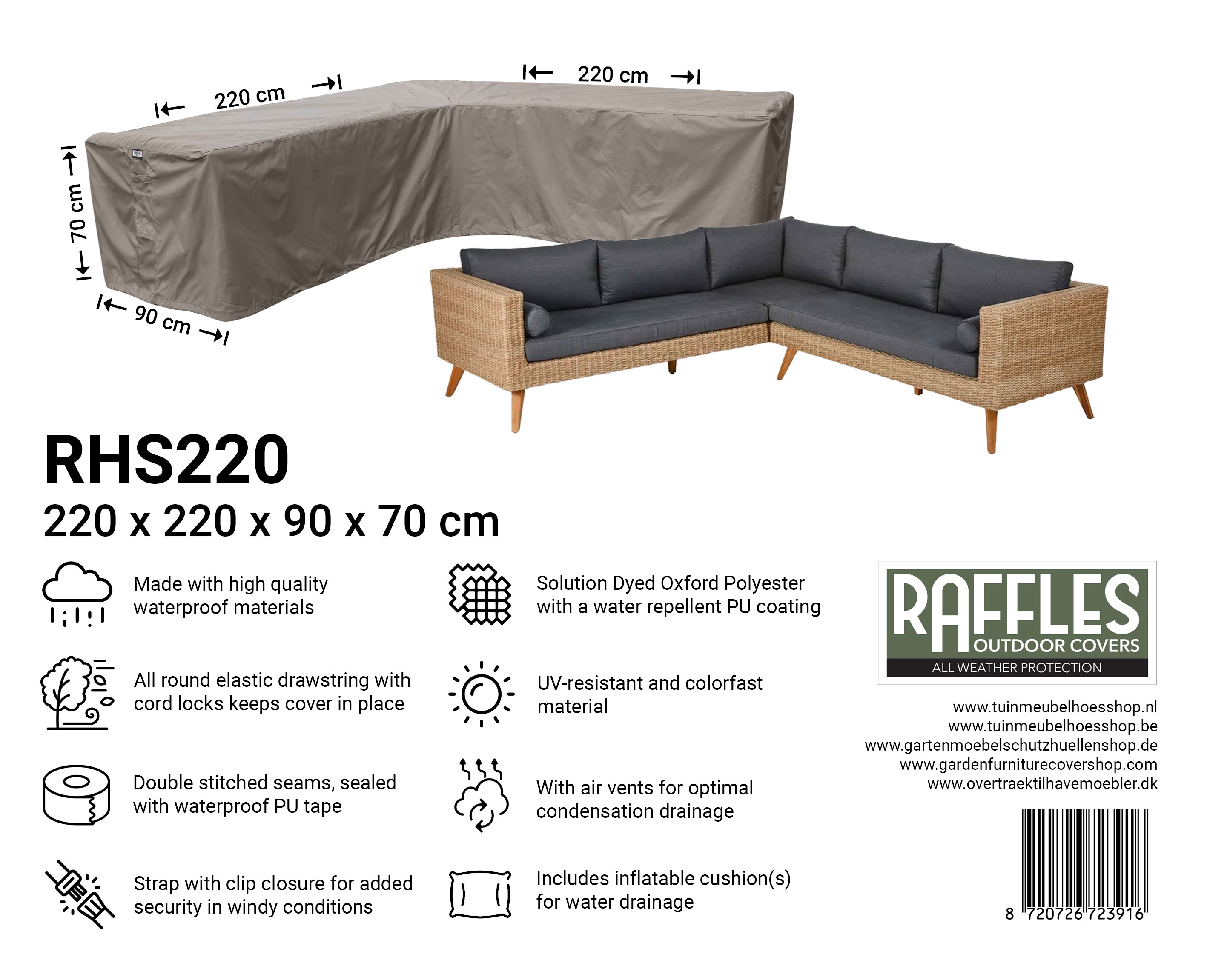 With the RHS Series corner sofa covers by Raffles Covers, you can protect your lounge corner sofa or L-shaped lounge set, from compact to XXL, all year round. Whether your corner sofa is placed on the patio, balcony, under a canopy or out in the garden, your lounge set stays protected against rain, dirt, green deposits and sunlight.