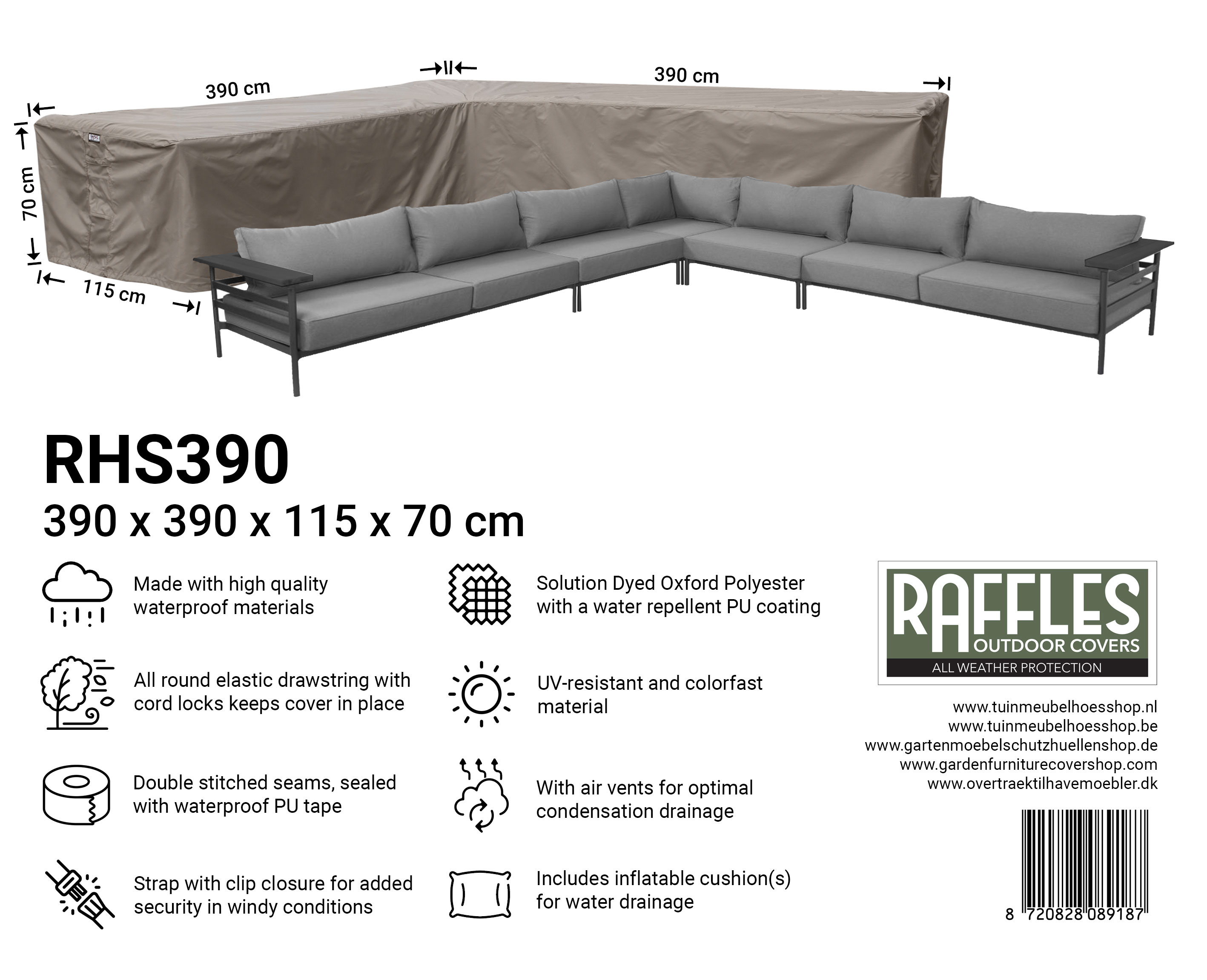 With the RHS Series corner sofa covers by Raffles Covers, you can protect your lounge corner sofa or L-shaped lounge set, from compact to XXL, all year round. Whether your corner sofa is placed on the patio, balcony, under a canopy or out in the garden, your lounge set stays protected against rain, dirt, green deposits and sunlight.