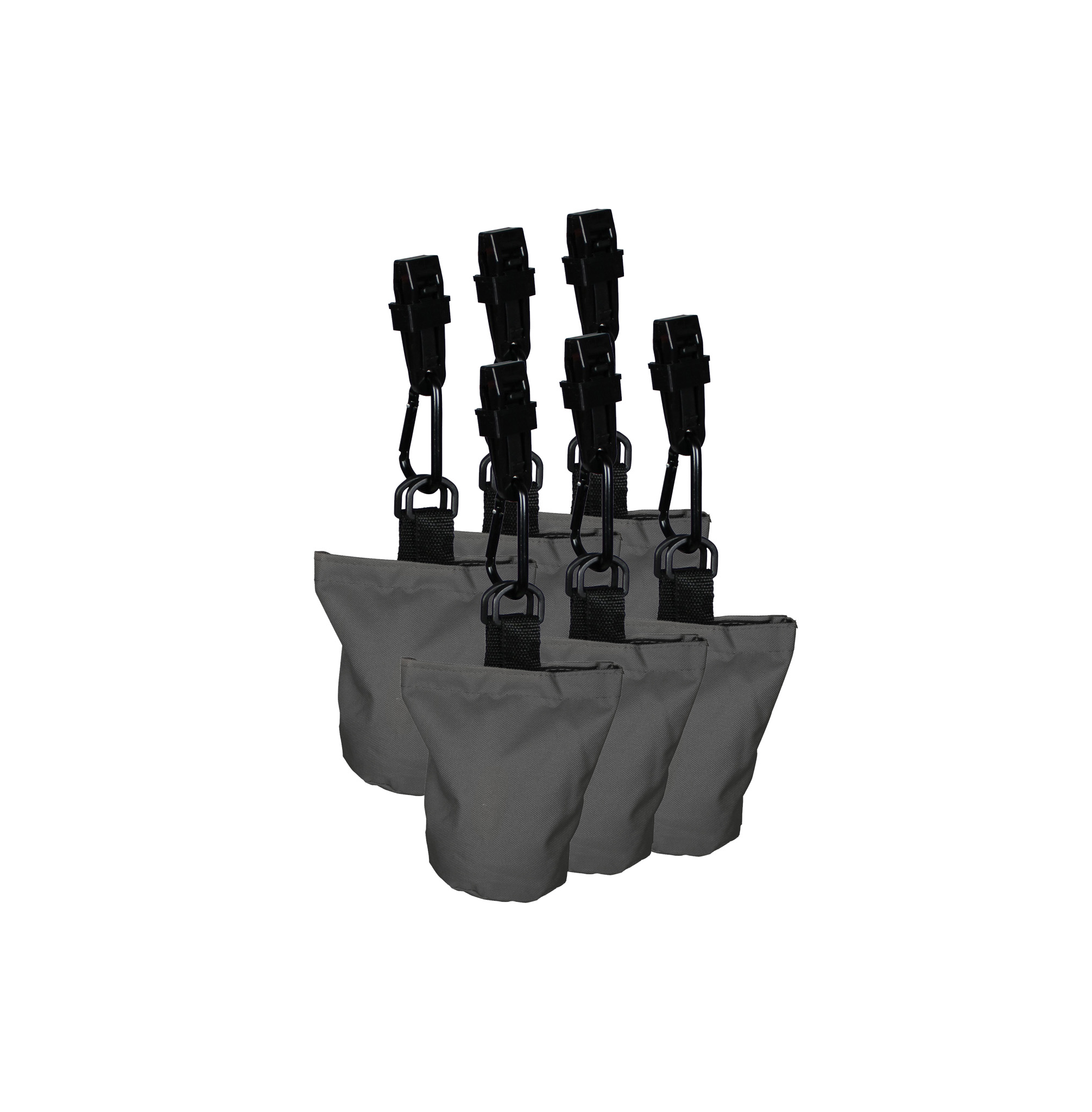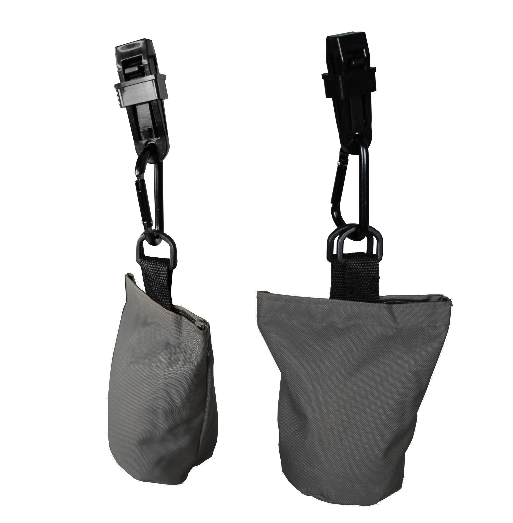 The sandbags are supplied empty and are fitted with a practical clamping system, allowing you to quickly attach them to the bottom edge of your cover. Depending on the set, they are equipped with a hook-and-loop fastening or a carabiner for extra secure mounting.